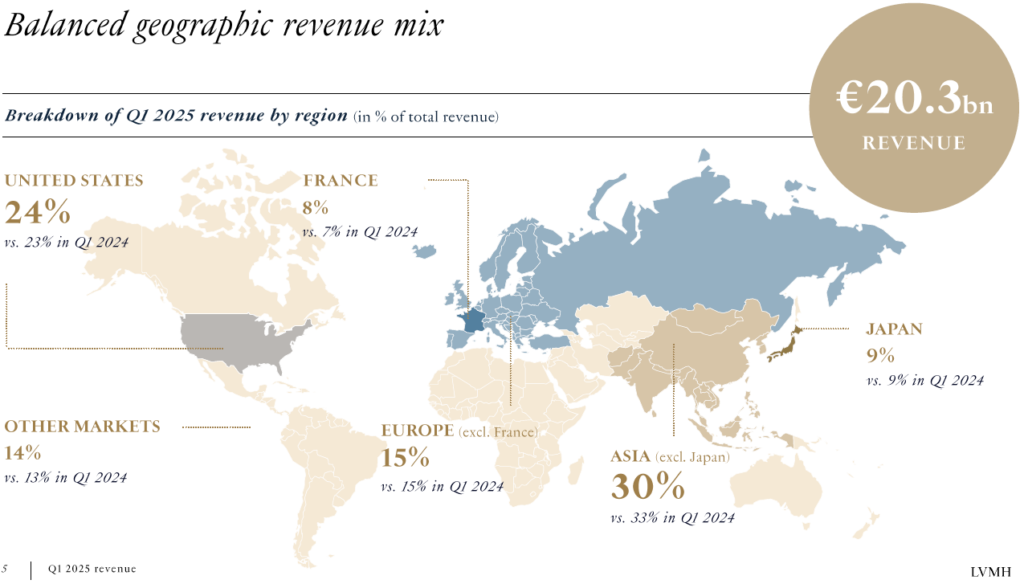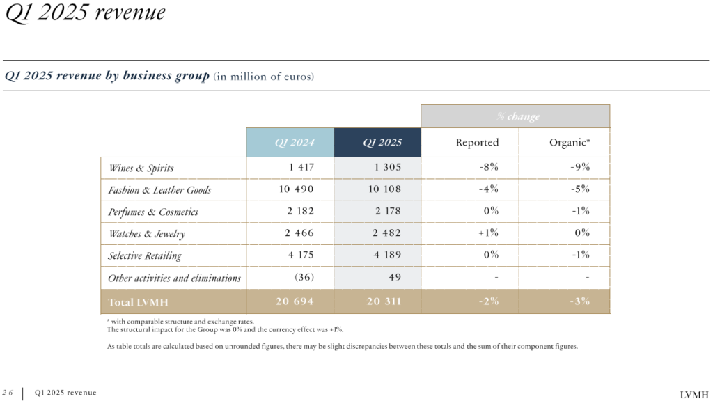 LVMH reported a 3% decline in organic revenue for Q1 2025, signaling a softer-than-expected start to the year for the world’s leading luxury group.